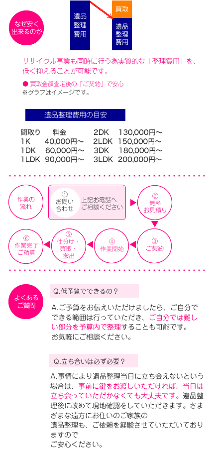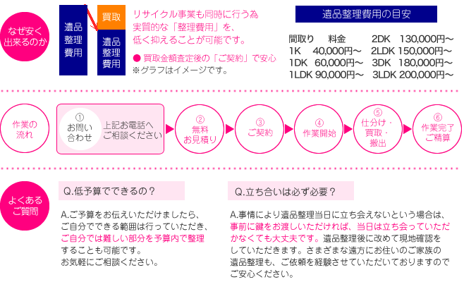 小さな不用品から家1軒まるごとまで、あらゆるケースの回収・片付け作業に対応いたします。明朗会計・見積りは無料です。見積り後の追加料金は一切ありません。